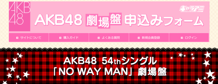 AKB48劇場盤申し込みフォーム|キャラアニ https://akb48.chara-ani.com/ AKB48 54thシングル「NO WAY MAN」劇場盤 抽選申込み 第一次受付: 2018年10月5日(金)18 … 続きを読む AKB48 54thシングル『NO WAY MAN』劇場盤受付中