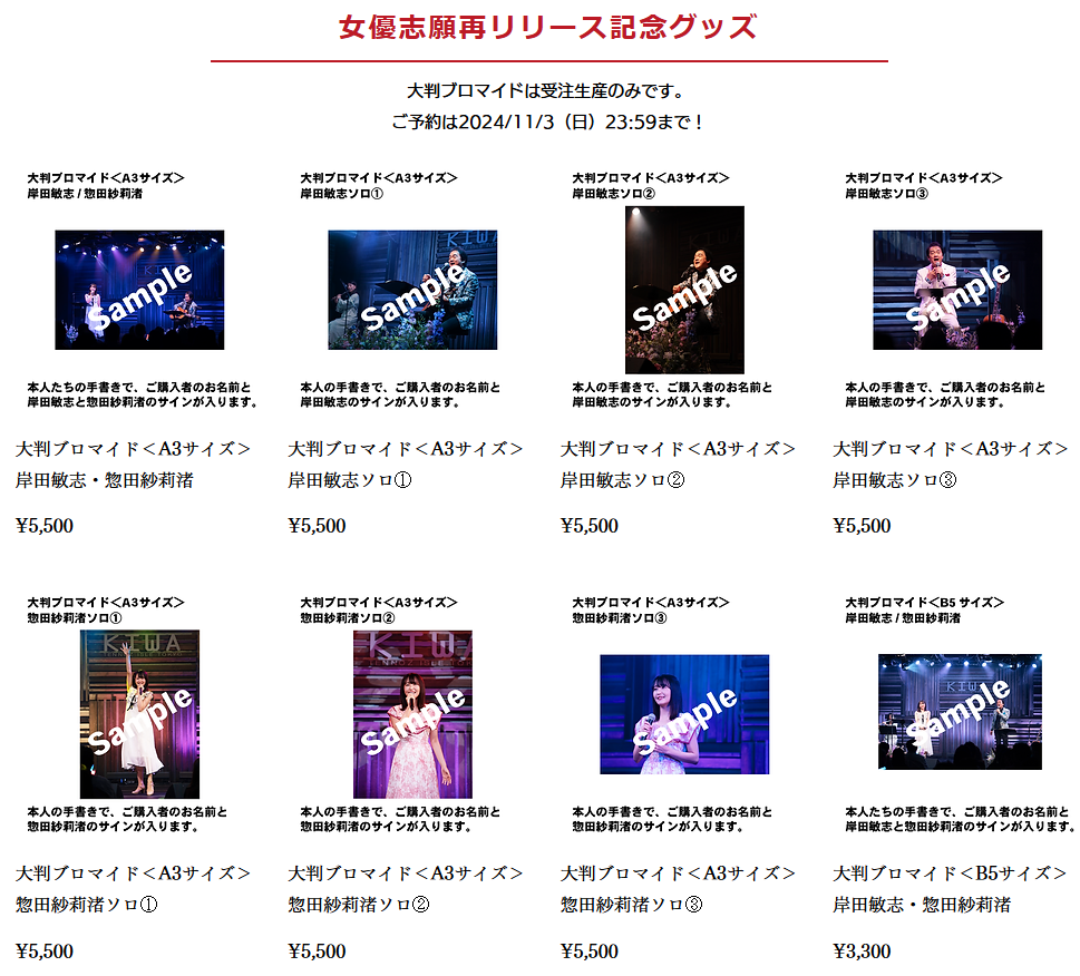 東京コンサートでの写真を大判で販売します。受注生産のみで写真には、岸田敏志または惣田紗莉渚の手書きでご購入者のお名前とサインが入ります。2人が写っている写真は両方のサイン入りです!