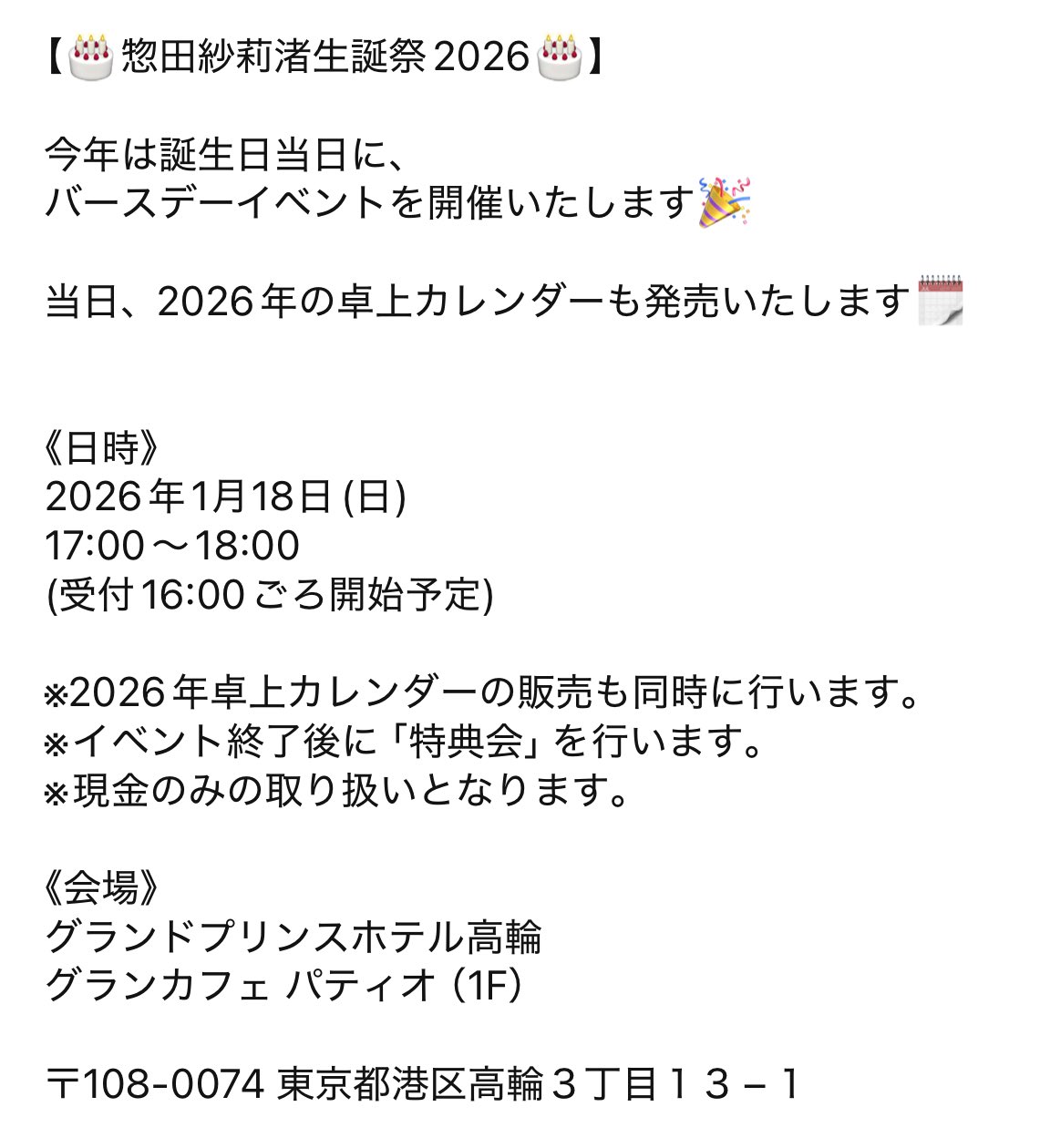 「惣田紗莉渚生誕祭2026」開催決定・受付中! 卓上カレンダーの販売も [2026年1月18日(日) 17:00~18:00 開催 グランドプリンスホテル高輪]