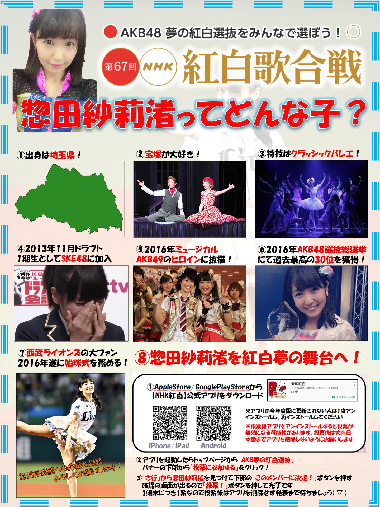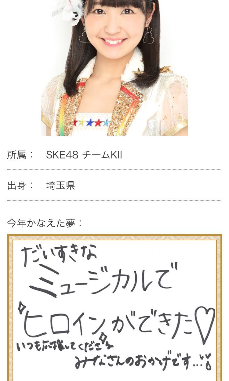 埼玉から名古屋で活動するようになって3年が経ちました。全国の方に見てもらえる紅白歌合戦で今年最後に最高のパフォーマンスを約束します!どうかよろしくお願いします。 pic.twitter.com/dDLDu1GVKU— SKE48惣田紗莉渚(旧アカウント) (@sarisari0118) December 16, 2016