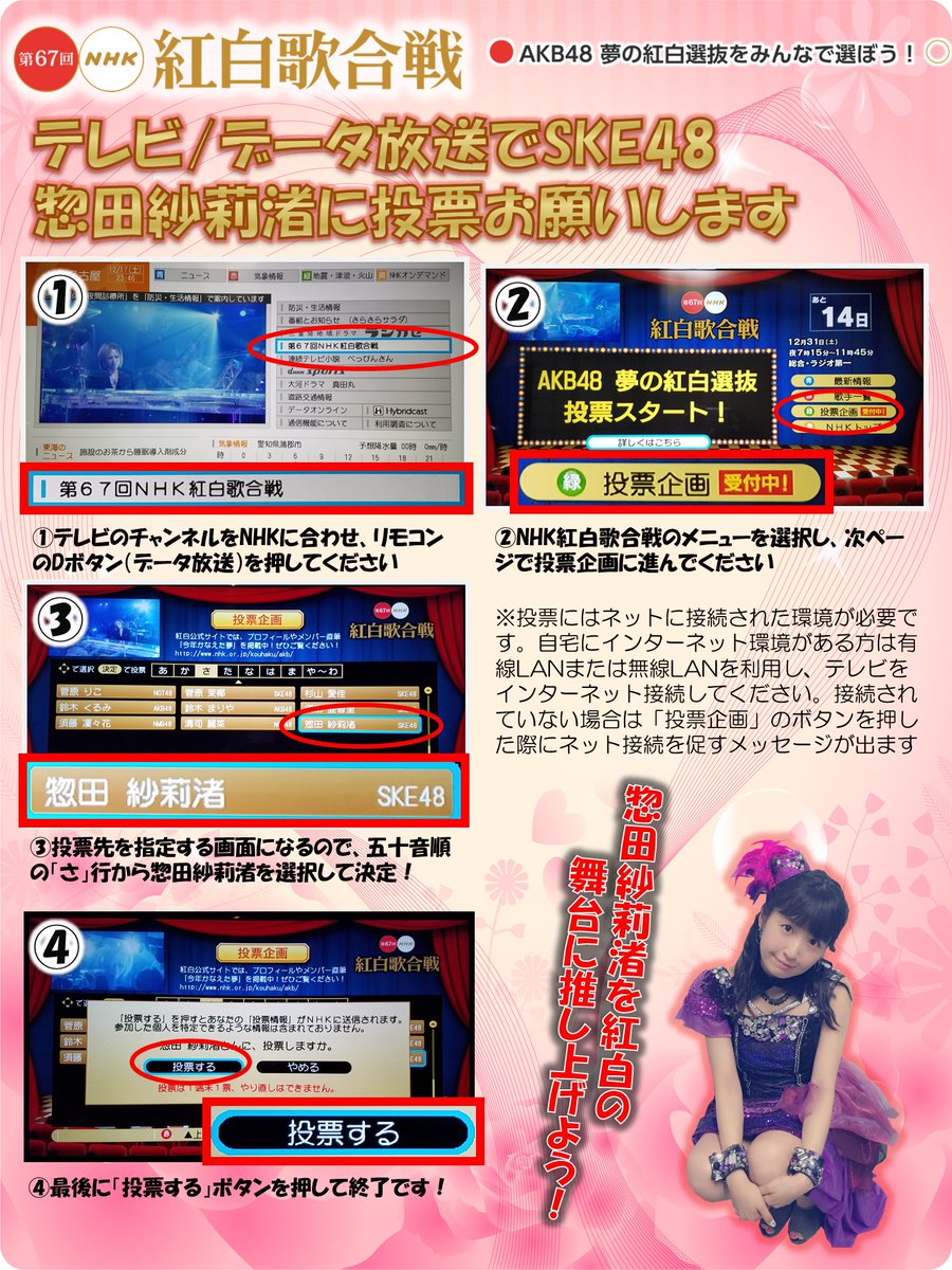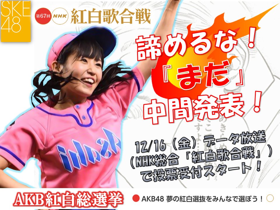 紅白歌合戦、今日からNHK総合さんのテレビのデータ放送からも投票が出来ます。SKE48の選抜として意地を見せたいです。
