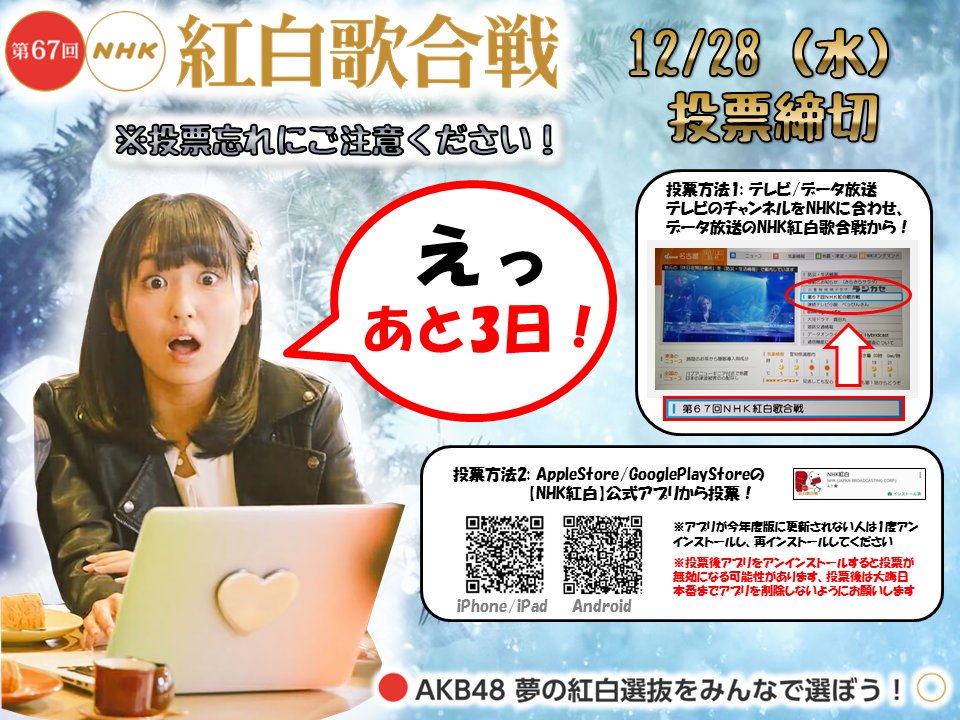 「第67回NHK紅白歌合戦」をより楽しんでいただくための公式アプリ「NHK紅白」がリリースされました!「出演通知」「AKB48 夢の紅白選抜をみんなで選ぼう!」などの機能をお楽しみいただけます。 #NHK紅白 https://t.co/2prvf2SyJb